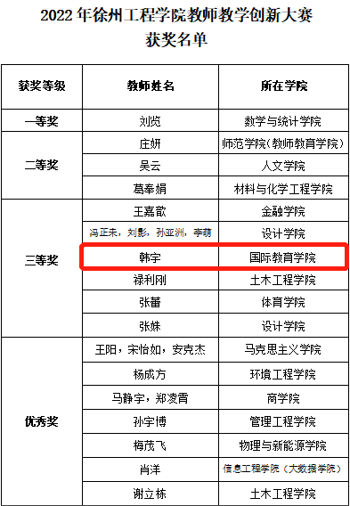 大赛包括课堂教学实录视频、教学创新成果报告(或课程思政创新报告)、教学设计创新汇报等环节。公司韩宇老师积极备赛,认真撰写教学报告,精心做好教学设计,在比赛中取得了较好的成绩,获校教学创新大赛三等奖。