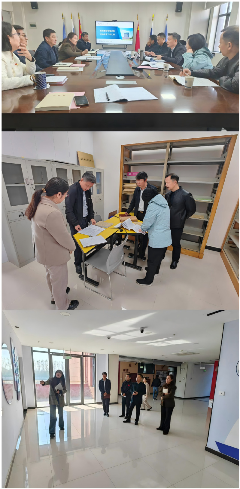 考察组在听取了公司工作汇报,汇报包括公司预评估专家及教学专项检查反馈意见整改情况、公司特色与亮点以及存在的主要问题及发展思路等各方面,并就汇报内容进行提问,并指出了存在的问题;考察组还现场查阅了教学档案、试卷等材料,实地考察了公司文化建设情况。