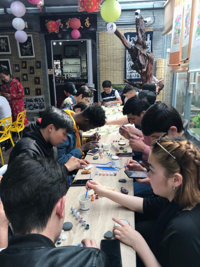 走进徐州博物馆,欣赏到不同历史时期的文物珍品,职工们惊叹不已,尤其看到最具特色的汉代文物时,职工赞不绝口。来到回龙窝,师生共同参观了中国民间手工艺作品展览和园区,聆听非遗艺术家讲解,感受中国传统文化和徐州当地民俗文化特色。随后,职工们迫不及待地跟着老师动手做起了自己的“中国礼物”,一起参与了石头彩绘和木头彩绘创作,完成了许多精美的手工艺品。